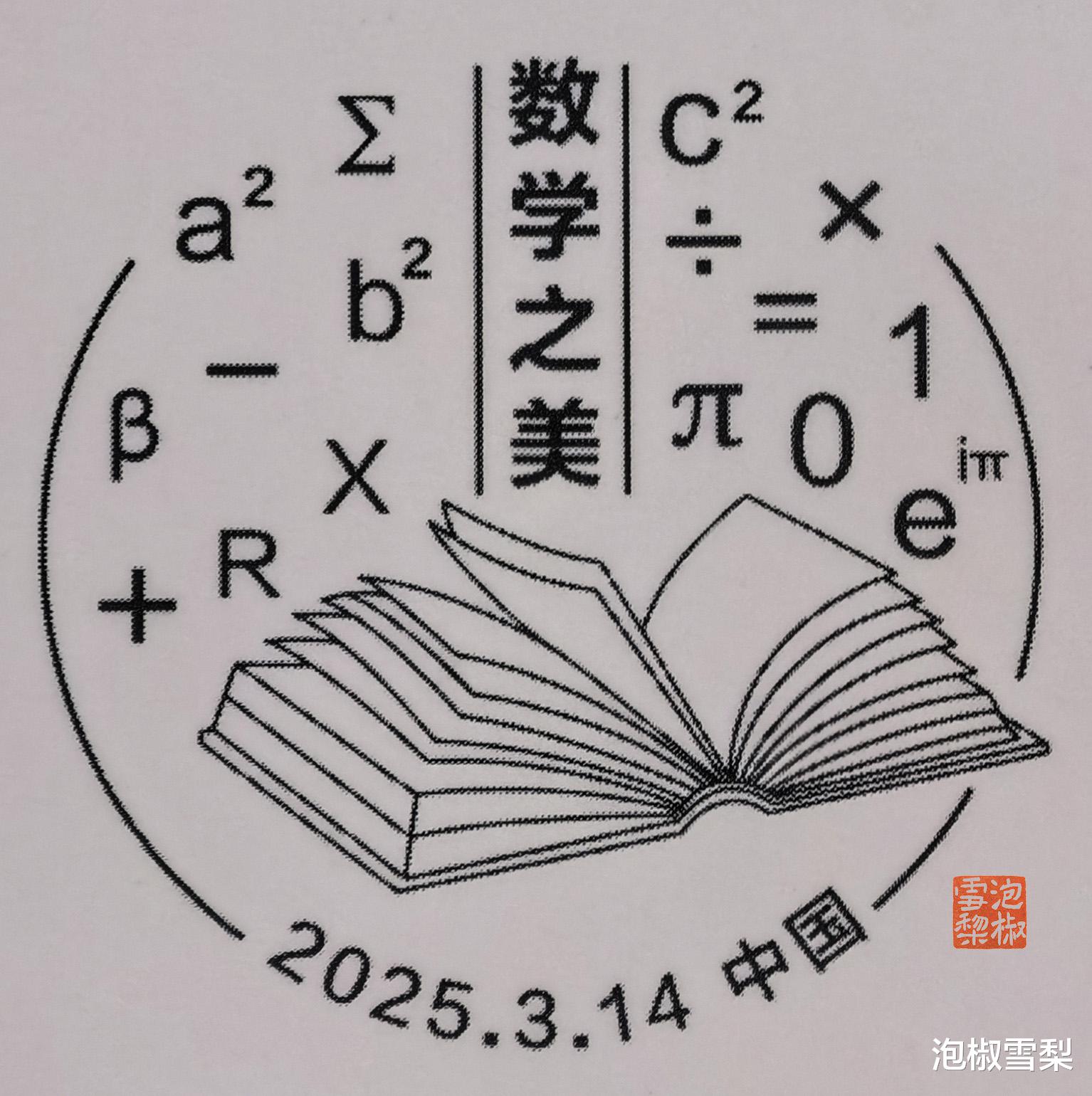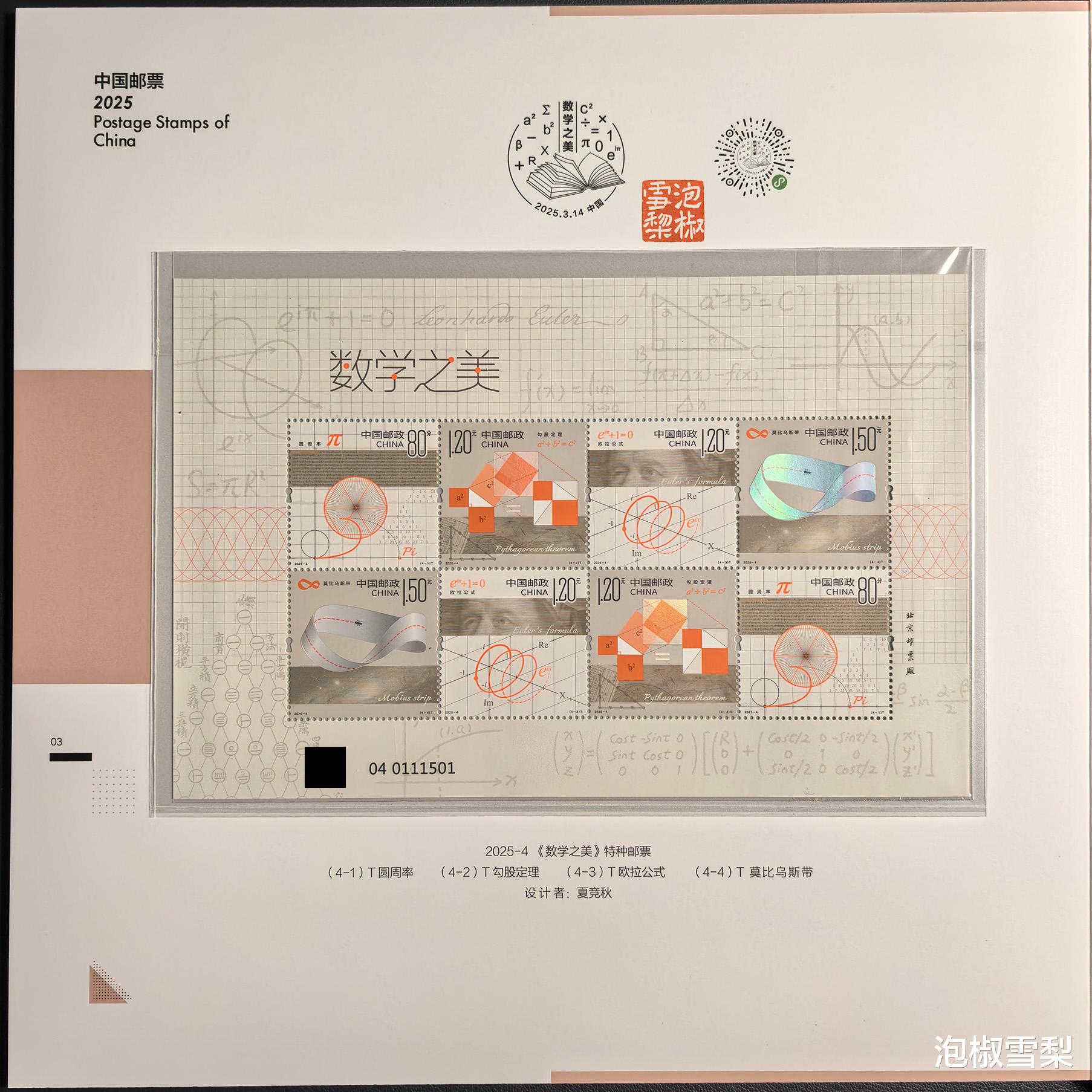 第三页为2025年第4套邮票《数学之美》版式二,小版上部印有首日纪念戳和二维码,下部为套票名称、每枚名称和设计者夏竞秋。