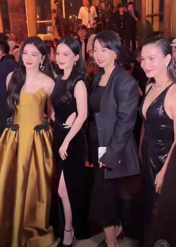 几个人站在一起,就完美展现出了什么叫五彩斑斓的黑;对比下来,其实还会发现卢靖姗的这一身还有一个优点,那就是光泽感很强,一眼望去真的很难忽视。