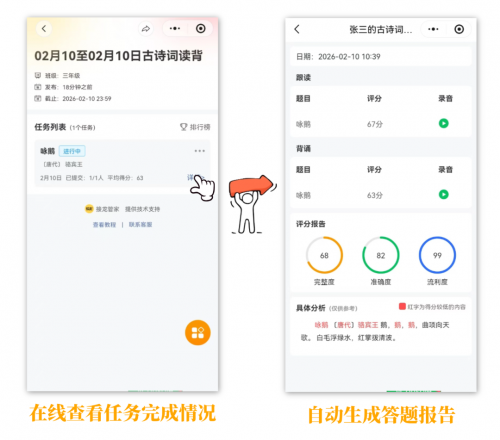 老师可快速发布智能作业,学生在线完成后,AI可自动判对错、打分,代替人工评判,精准识别书写错误、发音偏差,解放老师的双手。