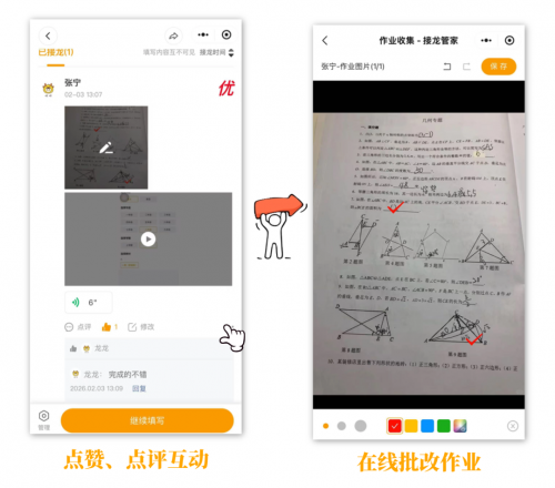 作业收集完成后,无需下载,老师可直接在接龙管家里在线检查、批改作业,省时又高效。
