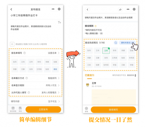 老师可简单修改细节并导入班级名单,完成后直接转发到班级群,学生点击就能提交作业,提交作业后名字自动点亮,未提交名单清晰可见,老师可一键通知未交学生,不用反复催促。