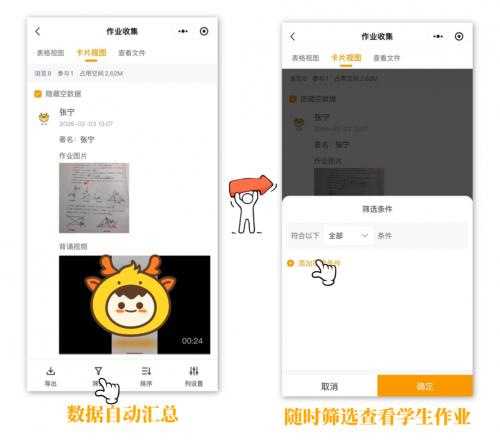 所有作业按学生姓名、提交时间分类整理,老师可随时在线查看、回溯,不用手动整理文件夹,省心又省力。