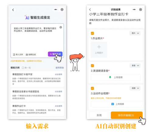 比如输入“发起小学三年级寒假作业打卡,要求每天提交作业照片,英语朗读录音、运动作业视频”,AI就会自动生成适配的作业接龙。