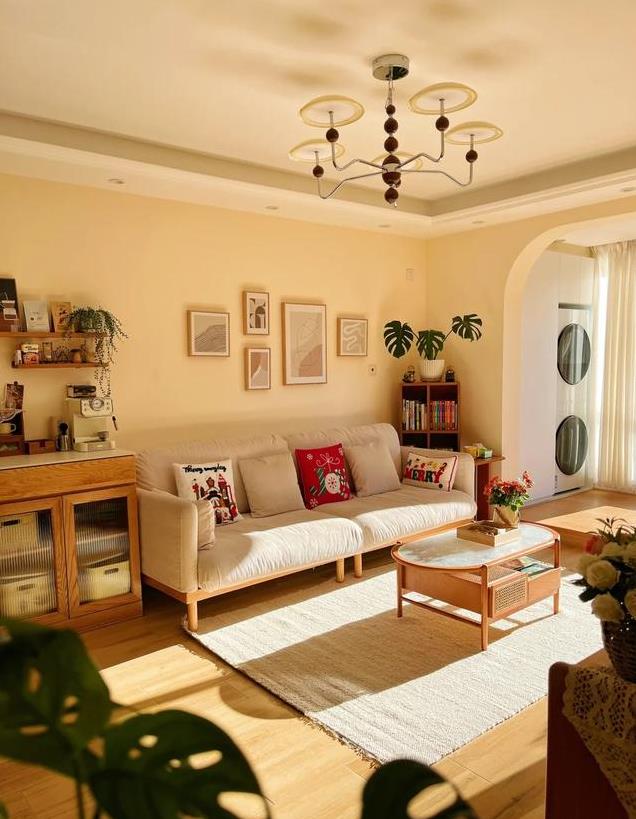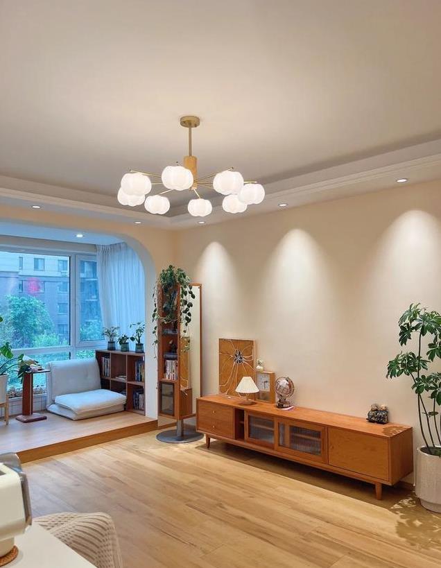 三六九通铺的木纹砖寓意步步高升 ,2.4m宽敞的沙发,随时接纳人类疲惫的身体 。樱桃木的茶几上摆满爱吃的坚果, 电视柜+边柜,收纳了家里的七七八八 。绿植的点缀让家里处处充满氧气和鲜活, 一盏吊灯更是照亮前进的路 。
