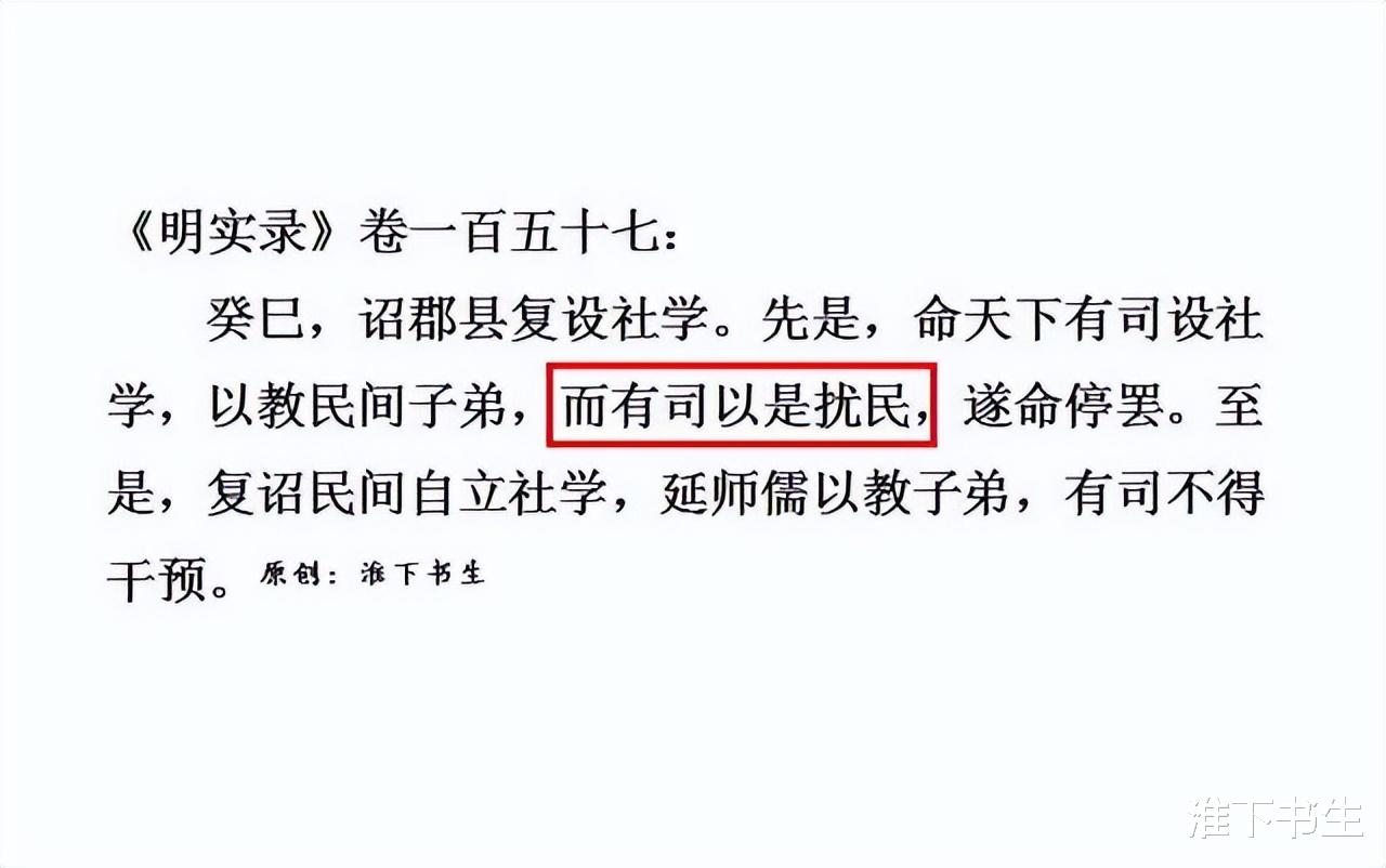 当然了,也有例外!就是老朱让天下有司设立社学,教民间子弟读书,有司认为这会扰民。老朱心想,平时你们干了那么多扰民的事情不自知,现在教百姓读书这么利好的事情,你们反而说这会扰民。于是,老朱让民间自立社学,聘请老师教育民间子弟,有司不得干预!