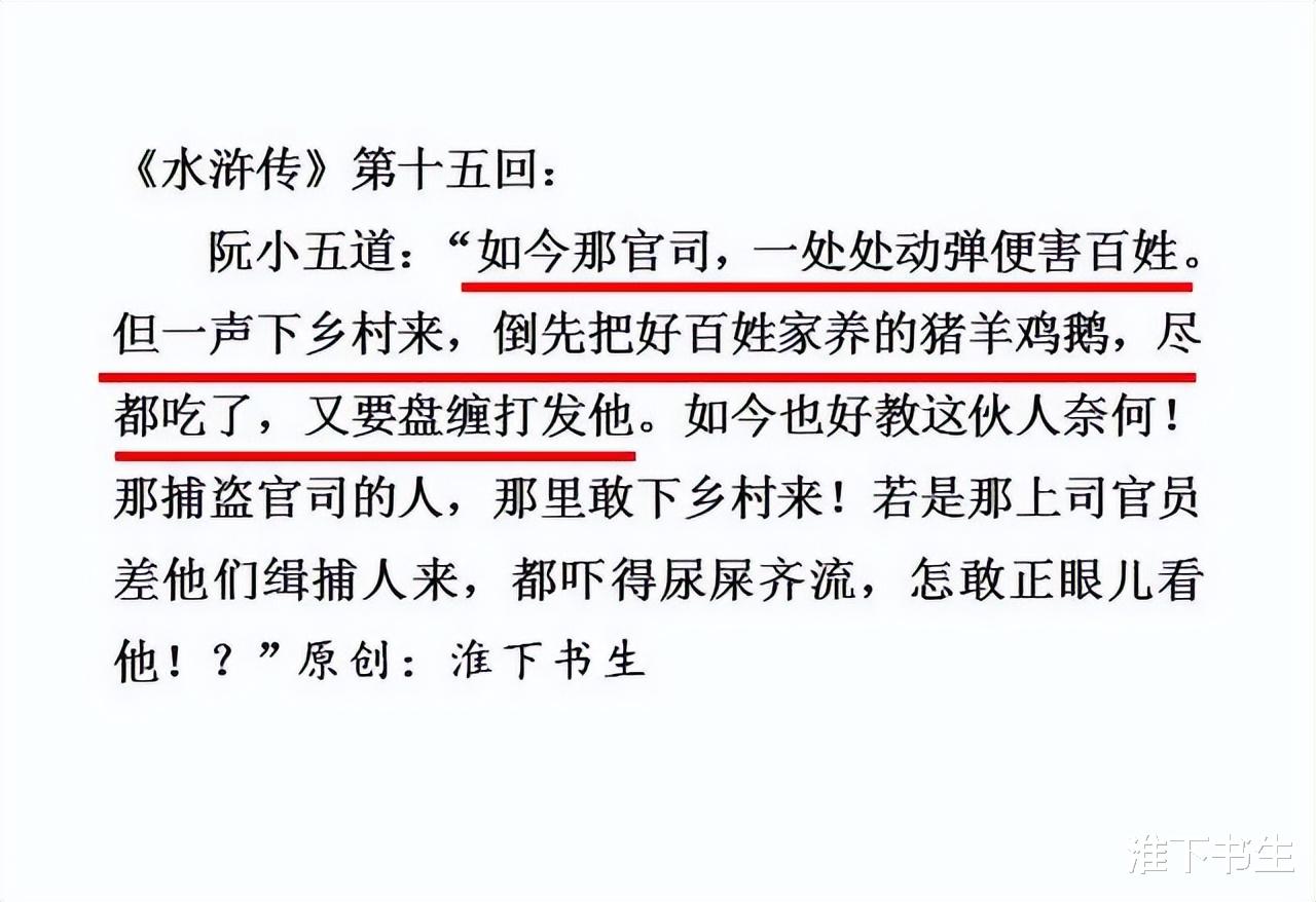 “阮小五道:‘如今那官司,一处处动掸便害百姓。但一声下乡村来,倒先把好百姓家养的猪羊鸡鹅,尽都吃了,又要盘缠打发他。’”