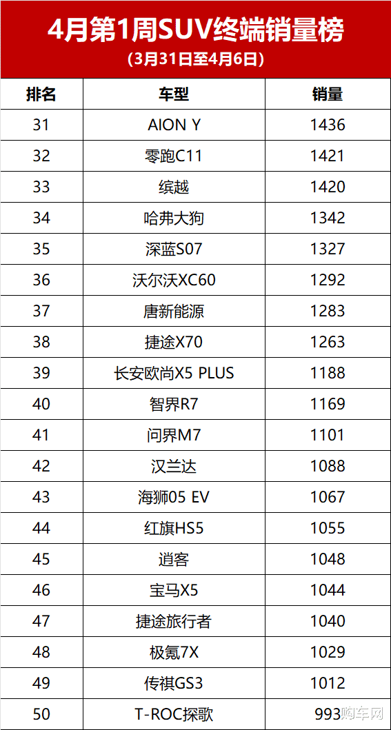 近日,基于新车上险量的2025年4月第1周SUV终端销量揭晓,国内SUV市场销量环比下滑出现较大幅度下滑。据统计,4月第1周(3月31日至4月6日,2025年第13周)销量前五十SUV车型终端销量只有9.6万辆,环比上周大幅减少35.3%。本周终端销量最高的SUV只有四款车型,而上周则达到十七款车型;本周SUV销量冠军的销量只有3763辆,而上周则达到14615辆。下面,我们一起去看看4月第1周SUV销量五十强车型的终端销量及其排名情况: