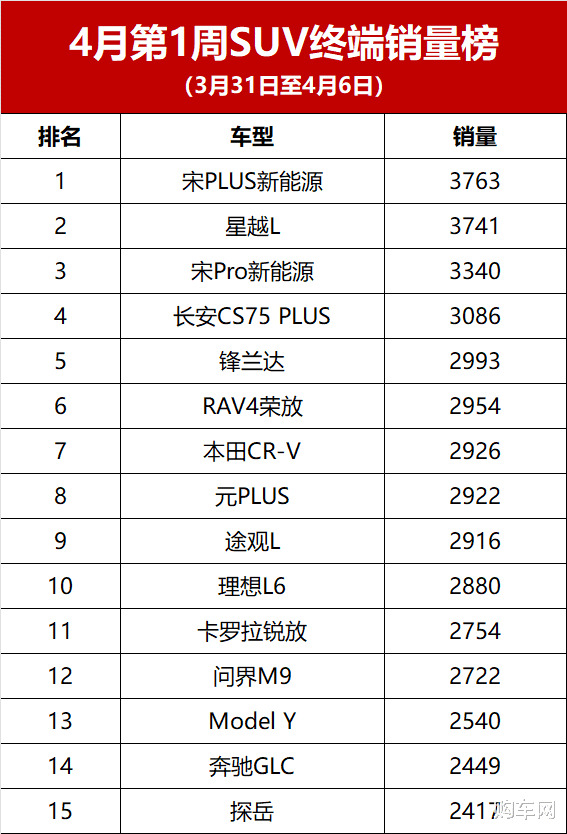 对于2025年4月第1周国内SUV车型的终端销量及其排名情况,您是怎么看的?欢迎留言讨论!
