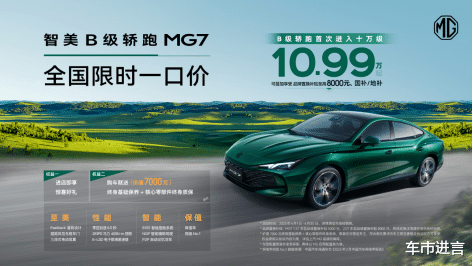MG一口价引爆车市,主销车型一步到位击穿底价!即日起至4月30日,智美B级轿跑MG7全国限时一口价10.99万元(起),这也让B级轿跑首次进入10万级价格区间。在一口价基础上,用户还可叠加享受至高8000元(1.5T车型5000元、2.0T车型8000元)品牌置换补贴以及国补、地补优惠。今年3月MG零售10000辆,同比大涨82.6%,一季度累计销量25839辆,同比增长13.1%,此次一口价政策的推出,在为消费者提供更多高价值车型选择的同时,也有助于强化品牌的市场认知度,推动市场份额持续扩张。