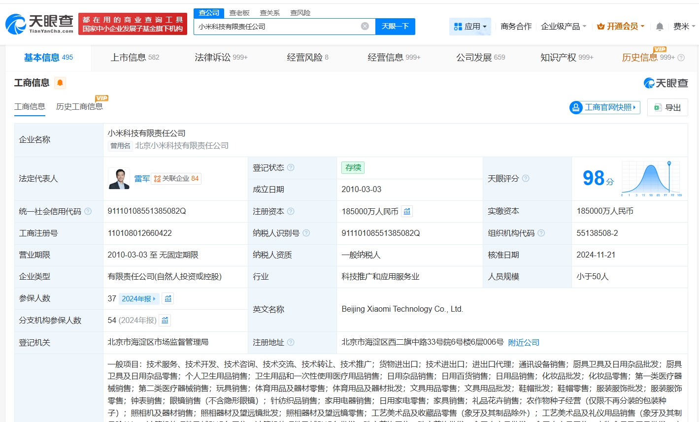 小米科技有限责任公司成立于2010年3月,法定代表人为雷军,注册资本18.5亿人民币,经营范围包括通讯设备销售、厨具卫具及日用杂品批发、厨具卫具及日用杂品零售等。股东信息显示,该公司由雷军、黎万强、洪锋、刘德共同持股。据媒体报道,此前,小米正式发布并开源了全新基础语言模型MiMo-V2-Flash,引发多方关注。