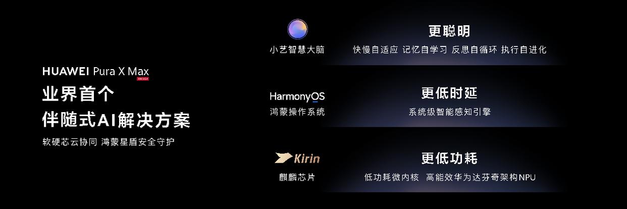 全新小艺智慧大脑,搭载Agentic 自演进架构具备像人脑一样的记忆、反思、进化能力。华为Pura X Max搭载的小艺伴随式AI,作为业界首创的伴随式AI解决方案,依托小艺智慧大脑能力深度融合鸿蒙操作系统和强大麒麟9030 Pro芯片,软硬芯云协同实现更低功耗、更低时延、更聪明的使用体验,配合鸿蒙星盾安全架构,筑牢安全防线。与此同时,小艺伴随式AI联合滴滴出行、咪咕视频、知乎等众多生态伙伴带来全新伴随式AI体验,并将与更多伙伴持续联合创新,开启伴随式AI新时代。