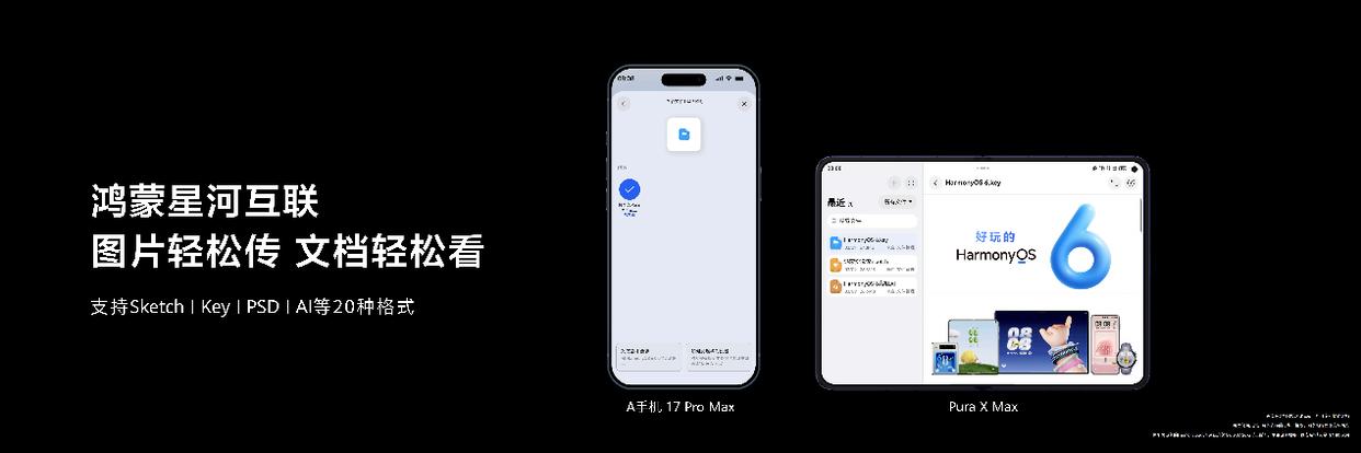 跨设备图片轻松传,文档轻松看:通过鸿蒙星河互联,iOS设备的图片和文档可以轻松分享给华为Pura X Max等鸿蒙终端设备,支持通过文档预览大师App打开Sketch、CAD等20种专业格式,解决了跨设备、跨格式文件查看和传输的难题。
