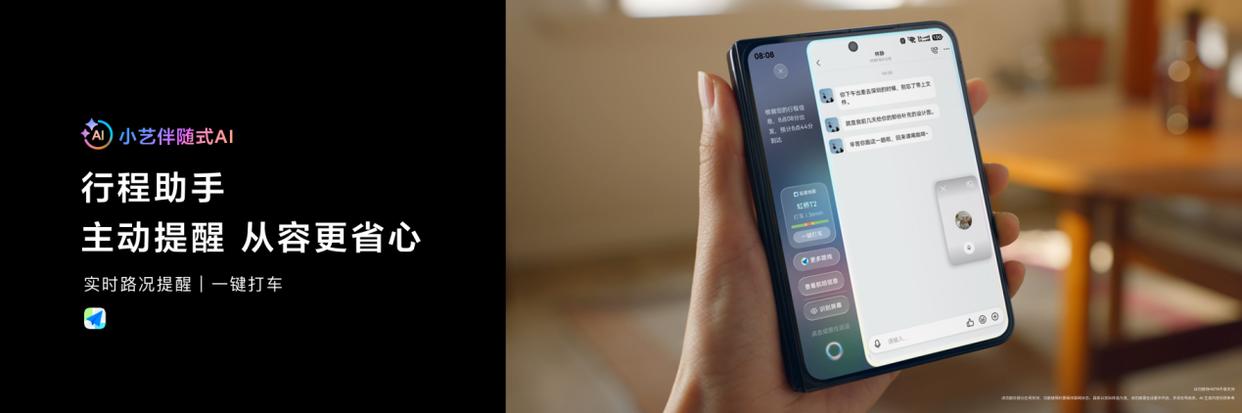 智慧出行,贴心护航:小艺伴随式 AI 与高德地图、滴滴出行等生态伙伴联合创新,在出发前,在小艺伴随式AI中,高德地图会根据用户行程以及实时路况信息,进行最佳出发提醒和路线规划;当用户飞机落地机场、火车到站时,滴滴出行会主动告知用户当前接驾时长,点击卡片即可一键打车。旅程贴心护航,出行更省心。