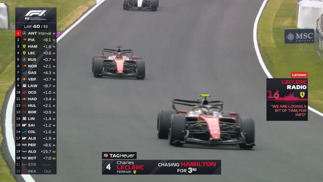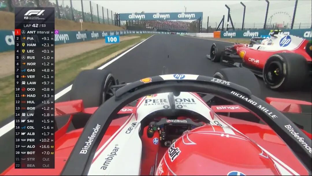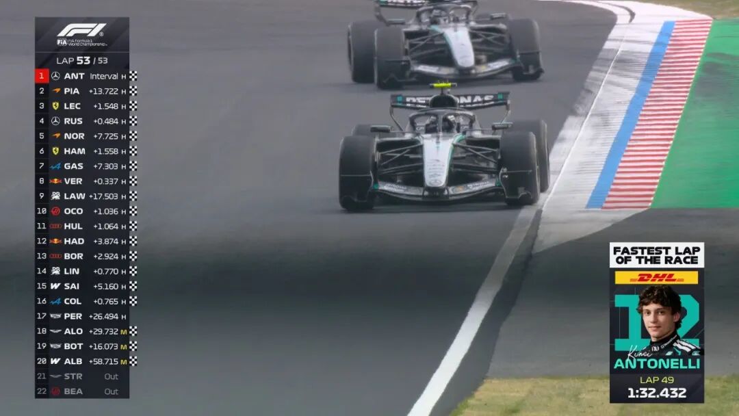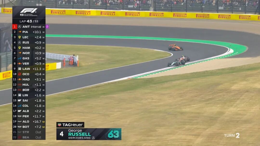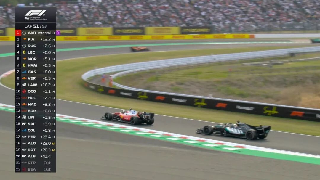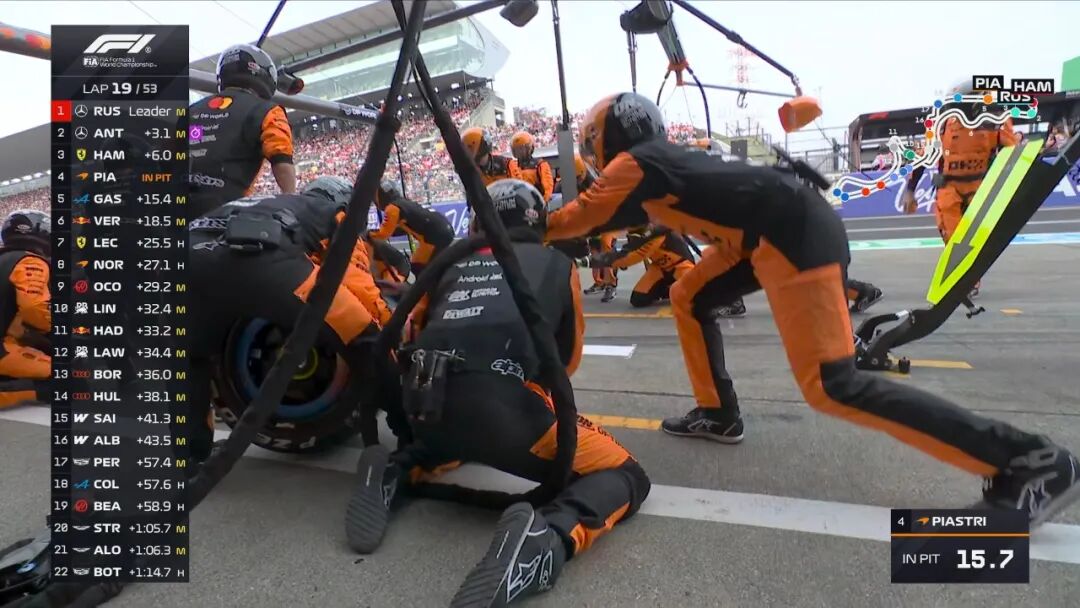 克拉平托在14号弯的防守线路值得商榷,但黄旗的出现让还没有进站的安东内利和皮亚斯特里获得了一次十分有利的进站!出站后安东内利继续排名第1,皮亚斯特里第2,拉塞尔第3,汉密尔顿和勒克莱尔分列第4和第5。