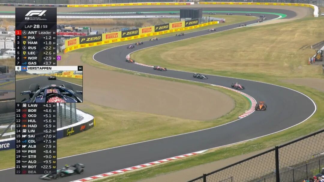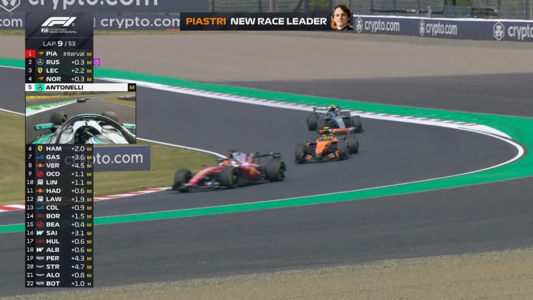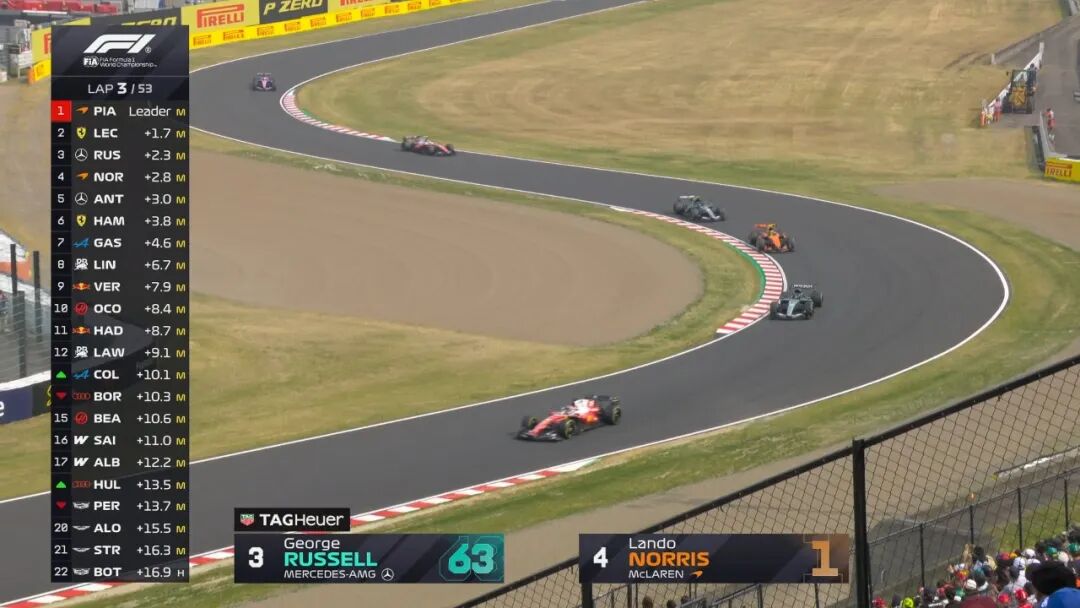回到正赛当天,经历了排位赛的争夺,梅奔双雄安东内利和拉塞尔于正赛头排发车。毫无疑问,安东内利被寄予厚望!反观皮亚斯特里终于迎来了本赛季的正赛首秀,而上赛季在这里收获杆位的维斯塔潘未能进入Q3,于正赛第11位发车。更有趣的是,日本站也是新赛季首次22辆赛车在发车格起步,这也是十多年来的头一回。另外,所有22位车手除了博塔斯使用白胎之外,其余车手均使用中性胎发车。