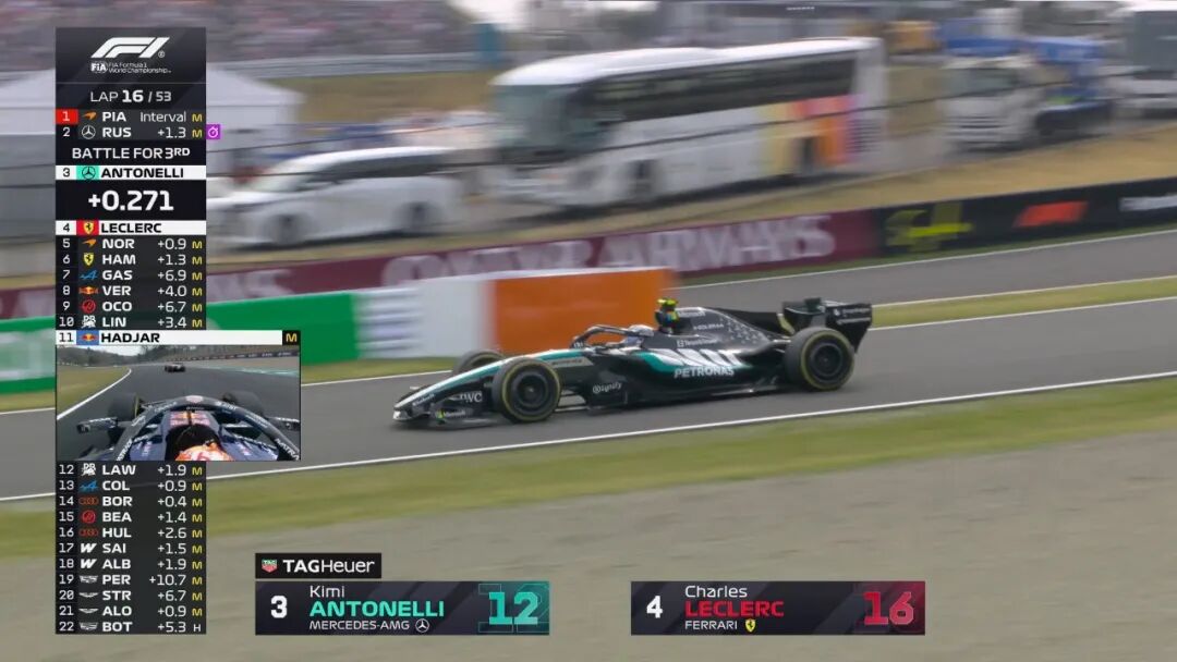 第16圈,安东内利在130r极其强硬的从外线获得优势,再一次复刻了自己在组合弯的超车动作,超越勒克莱尔来到第3!但出弯时赛车出现打滑的情况,随后被勒克莱尔在大直道上超越重回第4。