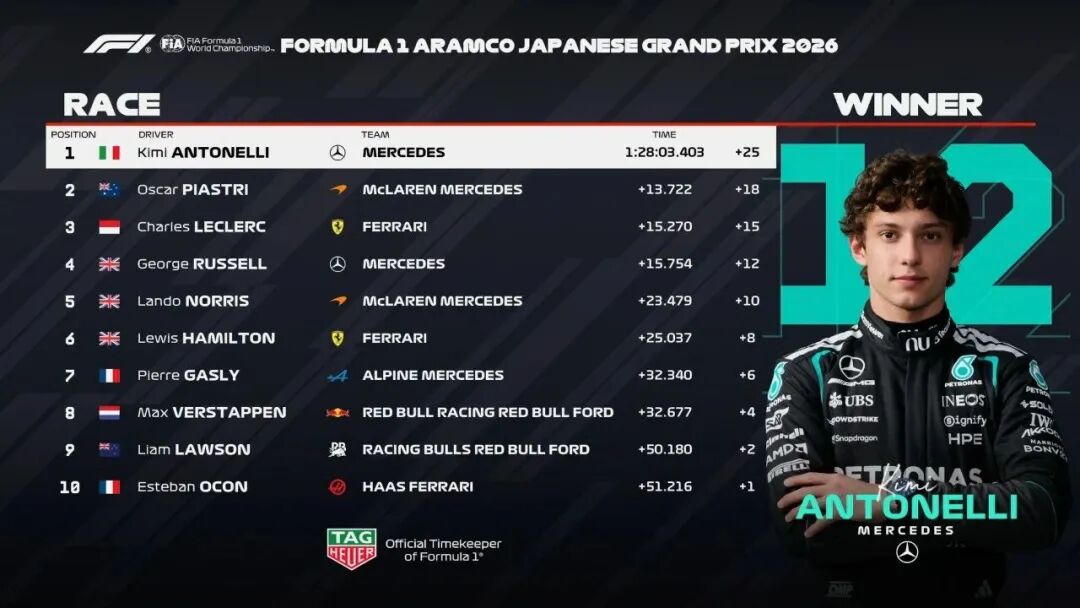 北京时间3月29日13:10,F1日本大奖赛灯灭起跑,最终由基米·安东内利锁定胜局。在安全车出动后,意大利小将凭借统治级的表现力压皮亚斯特里和勒克莱尔,夺得两连胜。同时他也成为继1953年的阿尔贝托·阿斯卡里之后,时隔73年又一位在F1赛场完成连胜的意大利车手,并以19岁216天的年龄成为F1历史上最年轻收获连胜的车手!也是F1历史上最年轻的积分领跑者!
