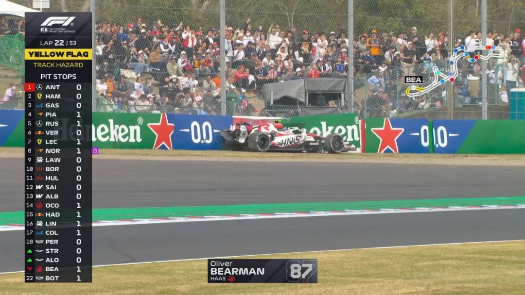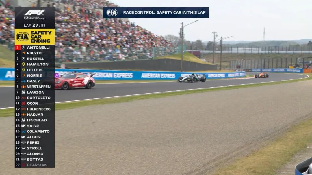 随后,当包括皮亚斯特里和拉塞尔在内的部分车手开始进站时,哈斯车手贝尔曼在第22圈遭遇严重撞车,引发安全车出动。这让尚未进站且暂时处于领跑位置的安东内利得以借机进站,并在出站后继续保持在第一名的位置。