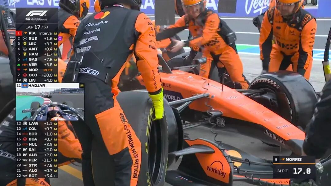 第17圈,诺里斯进站换上白胎,出站后排在奥康身后位列第9,随后对身前的奥康完成超越。