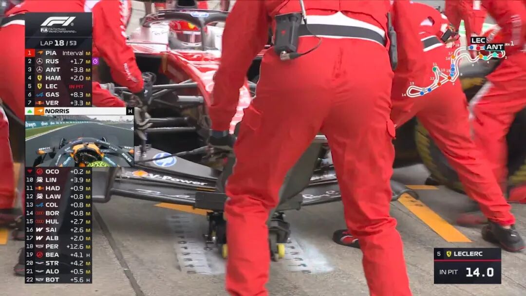 随后一圈,勒克莱尔进站,出站后卡在诺里斯身前1.5秒位列第7。第19圈,领先的皮亚斯特里进站,出站后位列第6。