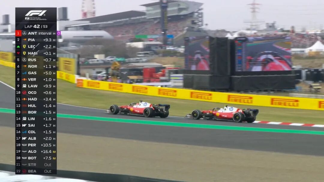 第43圈,拉塞尔从外线超越汉密尔顿,向前继续追击第3的勒克莱尔!