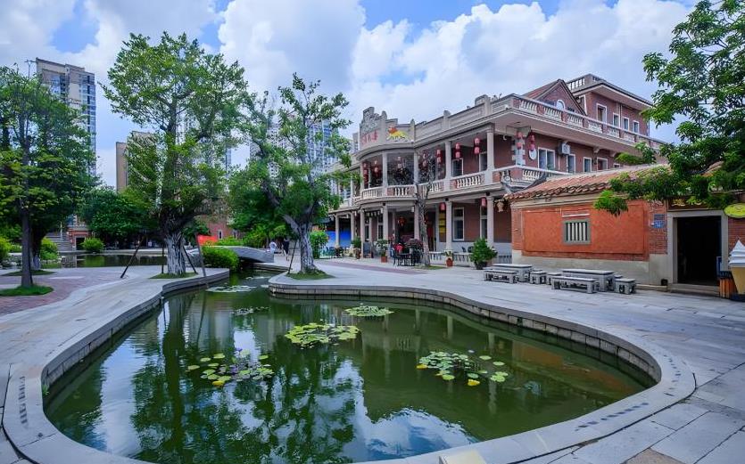 除此之外,在五店市传统街区的中心还有一片水池。池畔环绕着规整的石埕,石埕之外,错落分布着几处院落,花树错落,疏枝摇曳。街区里,人们三两成群,悠闲踱步。有的轻声细语,似在分享生活的点滴;有的欢声笑语,爽朗的笑声在空气中回荡。池中,锦鲤自在游弋,大人与小孩则纷纷蹲在池边,目光紧紧跟随着鱼儿,不时指指点点,为鱼儿的可爱模样喝彩。