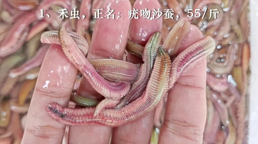 1、禾虫,正名:疣吻沙蚕,55/斤。规格大,饱满,55一斤真的很不错,市区卖得贵,要八九十。