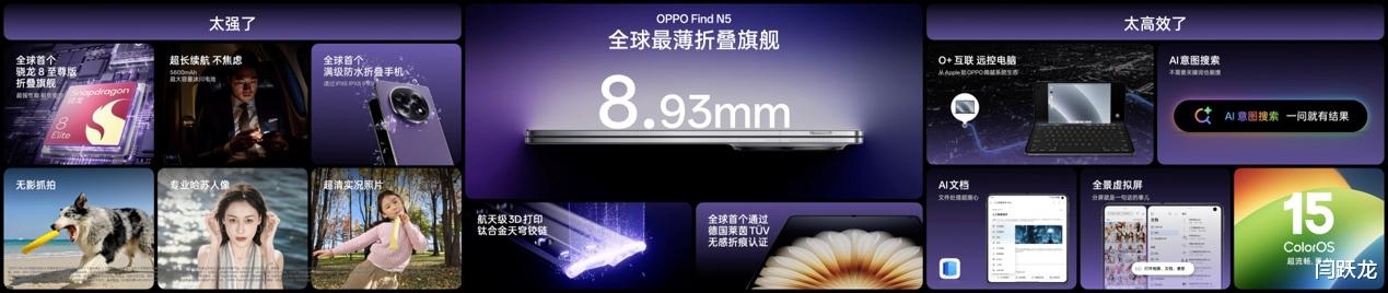 OPPO 首席产品官刘作虎表示:“一直以来,OPPO Find N系列用独创性的结构设计与的突破性的材料创新,持续引领折叠行业。Find N5 以航天级的钛合金 3D 打印技术,引领折叠旗舰进入 8 毫米时代。作为 8.93mm 全球最薄折叠旗舰,Find N5不仅钛薄了,更具备极致性能、极致续航、极致影像、满级防水,太强了!搭载 ColorOS15 的Find N5 还支持远控 Mac 电脑,AI 意图搜索,还有更好用的全景虚拟屏,太高效了!”