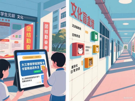 我们把 “校园文化” 植入生活场景:在图书馆的台灯上贴二维码,扫码能看 “学霸的一天”;在操场的跑道旁画 “文化脚印”,每跑过 100 米就弹出一句学生原创的文化感悟。这些 “碎片化” 的呈现,让文化不再是 “高大上” 的口号,而是 “低头可见” 的日常。某学生说:“现在走在校园里,总觉得处处都有小惊喜。”