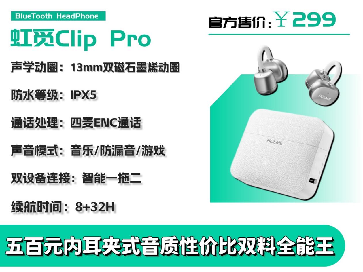 热门口碑款耳夹式耳机推荐!虹觅Clip Pro价格:299元推荐程度:⭐⭐⭐⭐⭐
