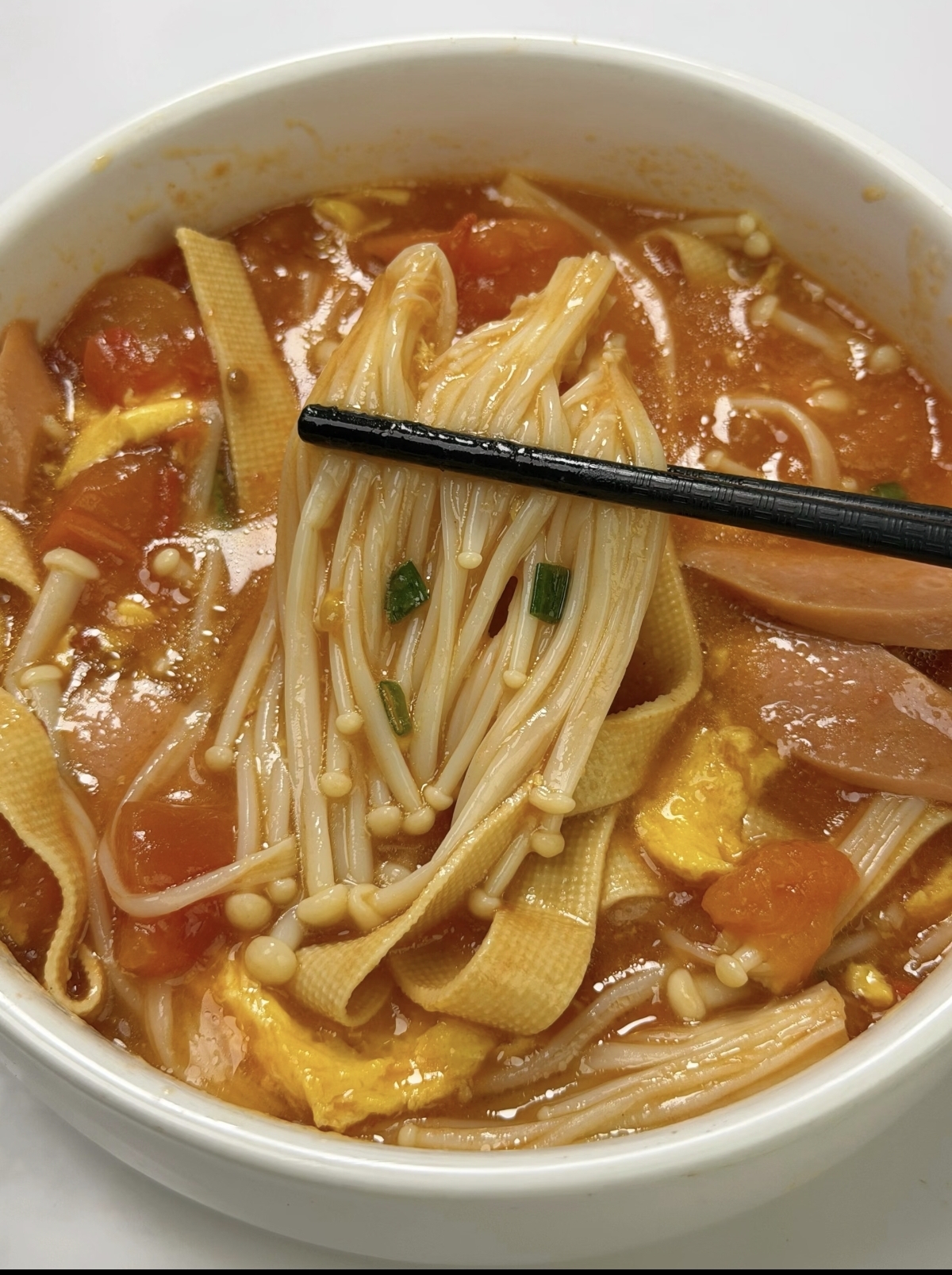 这碗汤的魅力,首先在于它食材的巧妙搭配。番茄,是天然的“增鲜剂”,经过炒制后,能释放出浓郁的酸甜风味和诱人的红色汤汁,为整碗汤奠定了醇厚的底味。金针菇,口感爽滑脆嫩,自带一股独特的菌菇清香,不仅丰富了汤的层次感,还带来了满满的膳食纤维。而豆皮,作为优质植物蛋白的代表,吸饱了番茄的汤汁后,变得软嫩入味,每一口都饱含着浓郁的鲜香。这三者相遇,简直是天作之合,共同谱写了一曲鲜美的味蕾交响乐。