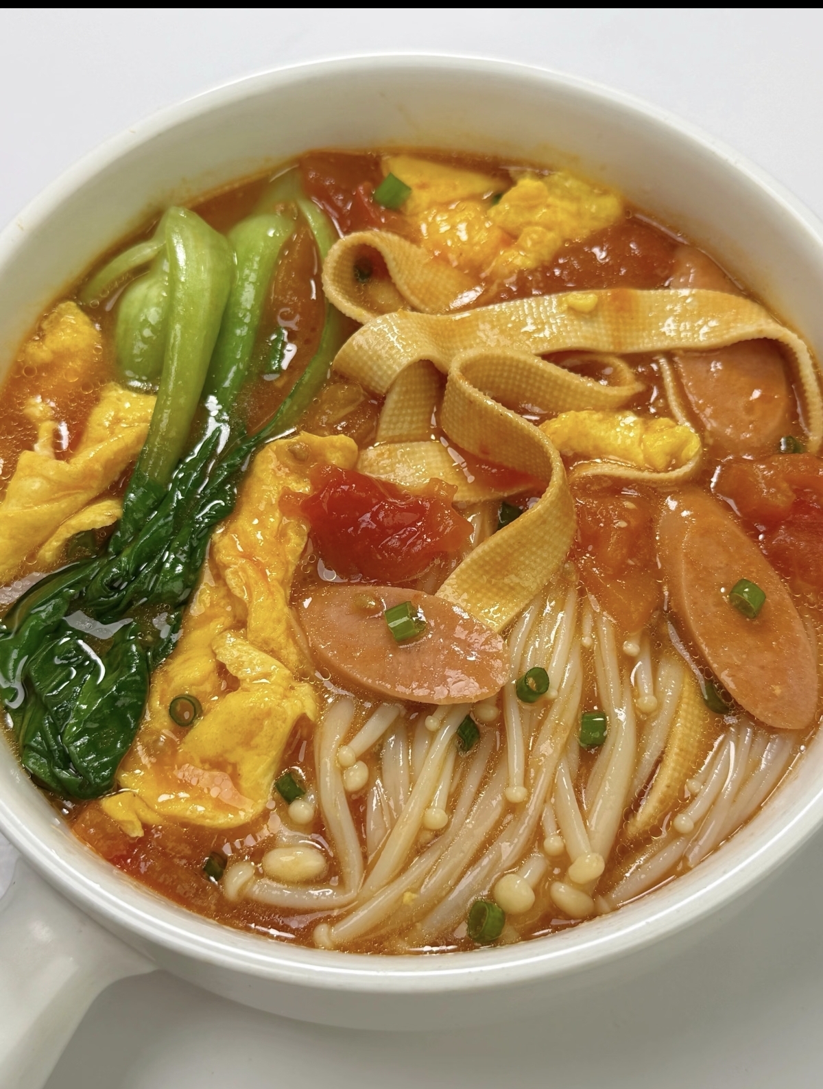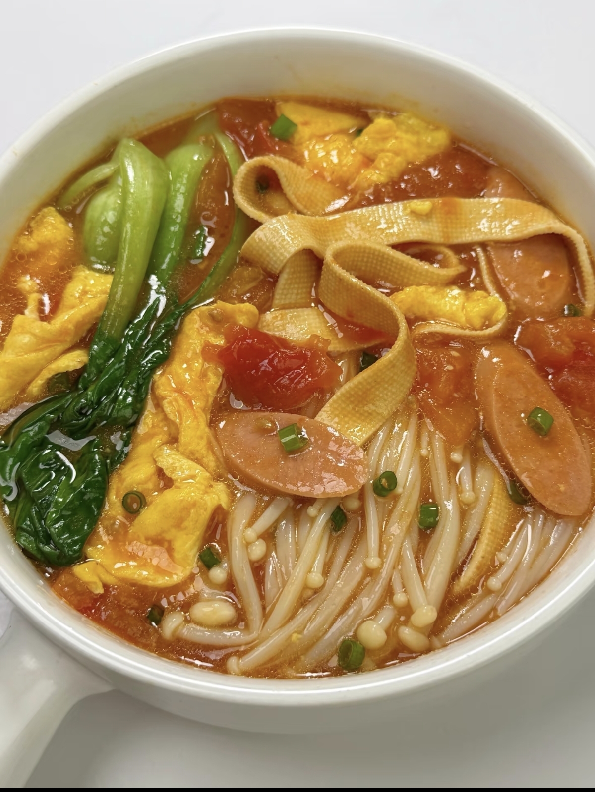端上桌,那红艳艳的汤色就让人食欲大开。浓郁的番茄香气混合着菌菇的清香扑面而来,喝一口汤,酸甜适中,鲜美无比,暖流瞬间从喉咙滑到胃里,整个人都舒展开了。金针菇爽滑,豆皮软嫩入味,每一口都是满满的幸福感。关键是,这道汤热量极低,蛋白质和膳食纤维却很丰富,既能满足味蕾,又不用担心长胖,简直是减脂期的福音,也是日常家庭餐桌上的健康美味之选。