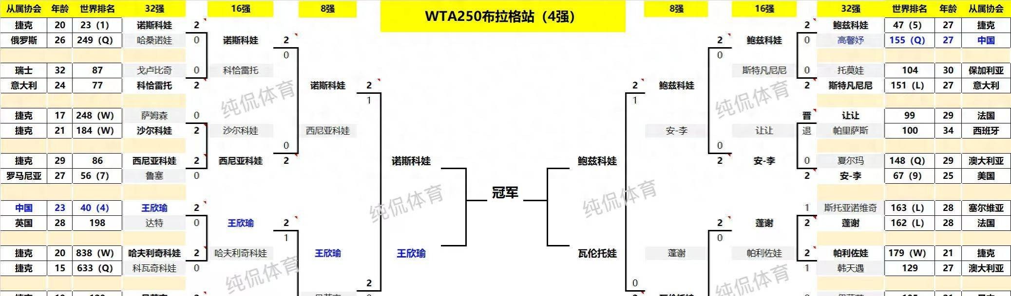 在2023年7月25日,北京时间,WTA250布拉格站的半决赛迎来了紧张的对决。当天的比赛对于球迷来说格外引人注目,因为中国选手王欣瑜将与捷克的头号种子诺斯科娃争夺决赛席位。这场备受关注的较量成为了球迷们热议的焦点,下面就为大家带来这场精彩半决赛的详细报道。