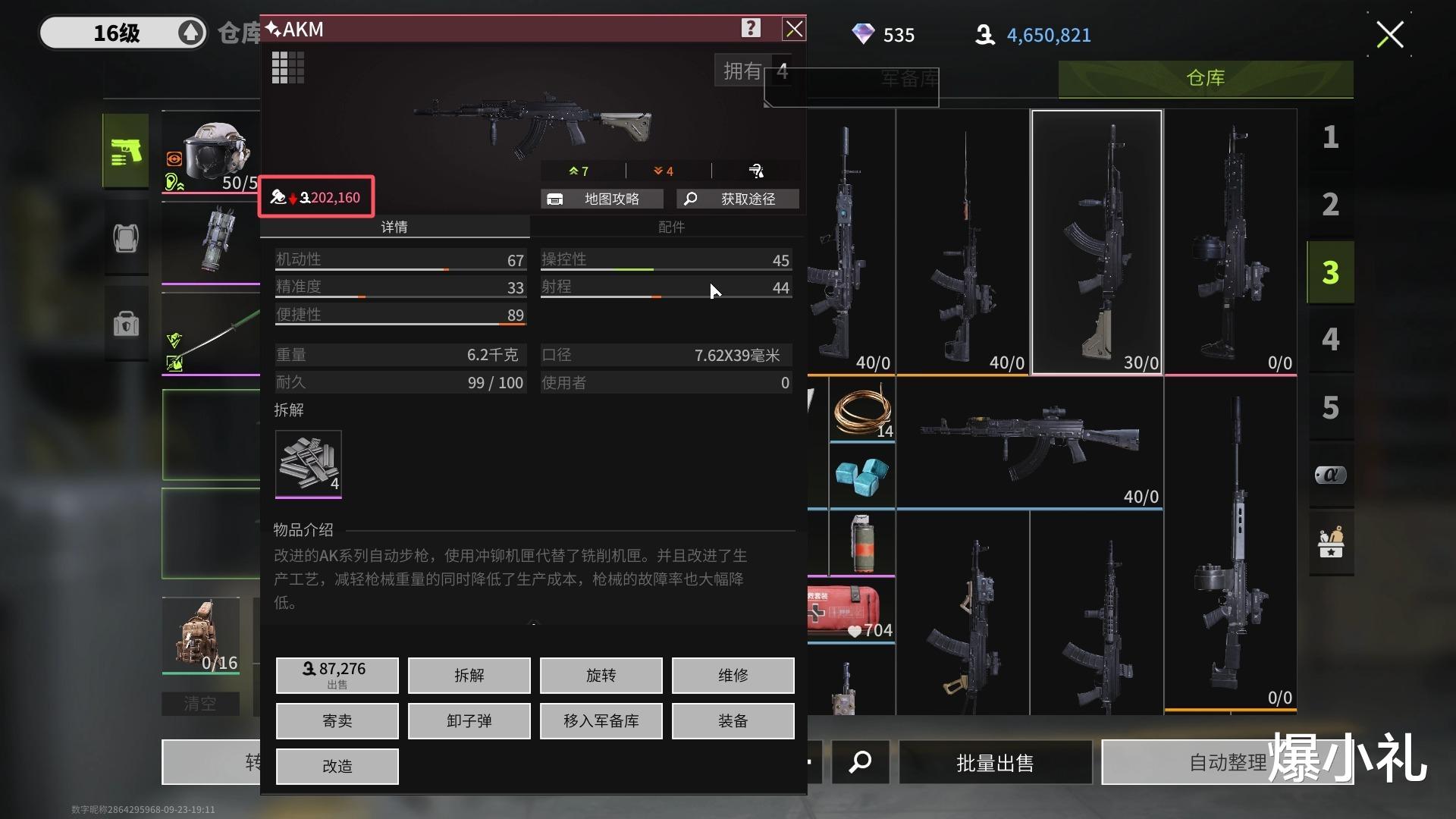 第二把:AKM,和前边的武器一样,作为AK系列的武器,武器继承了AK系列的特点,火力猛,伤害高,特别值得一提的是这把武器捡到就是赚到,一把能卖20多万,去寄卖市场卖的话,保底就是18万,最重要的是这把武器的子弹也不难生产,隔壁要凑很久的材料,它的子弹却不需要考虑这些事情,直接弄就行了。
