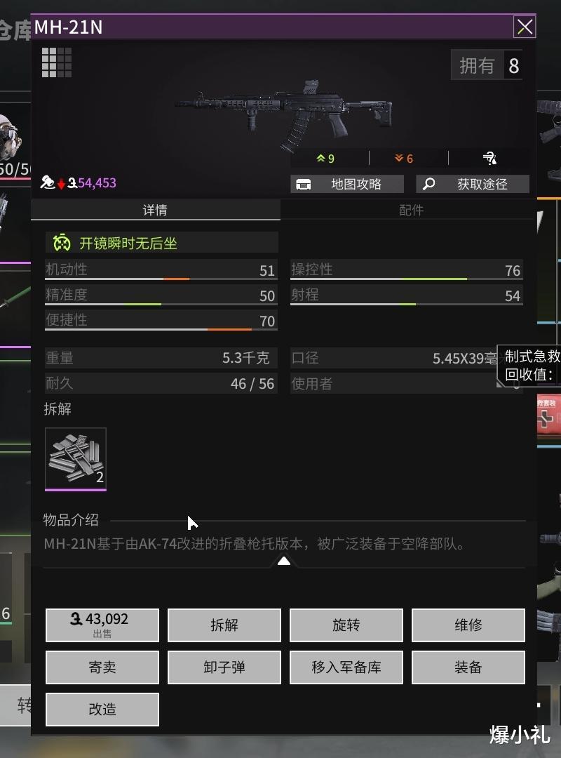 第四把:MH-21N,和之前的AK103一样,这把武器就是它老祖宗74的折叠版本,因此,性能方面,跟AK103没啥太大的区别,不过,也不知道是咋回事,这把武器的子弹泛用性居然比AK系列要很多,可以通用很多类型的子弹,不用担心无弹可用的糟糕局面,因此,这把武器也算是突击步枪里面的佼佼者了。