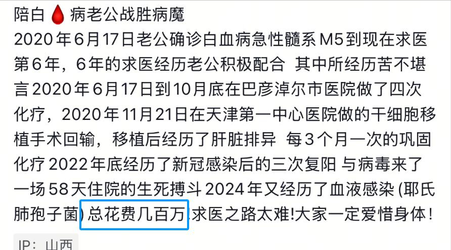 2024年再次经历血液感染,前前后后总计花费了几百万,一个普通的家庭花费这么多,足以看出妻子和家人们对他的期望很高。