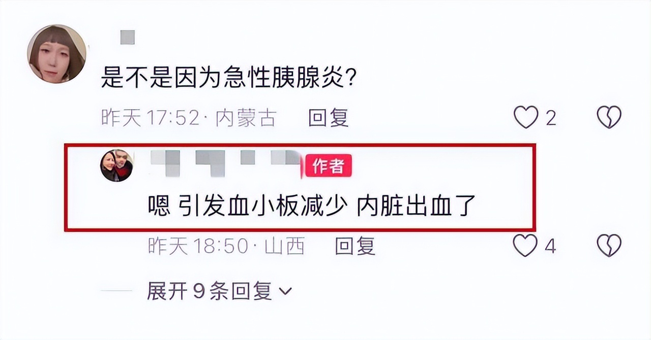 后来有网友留言是不是急性胰腺炎?付斌妻子回答“嗯,引发血小板减少,内脏出血了”。