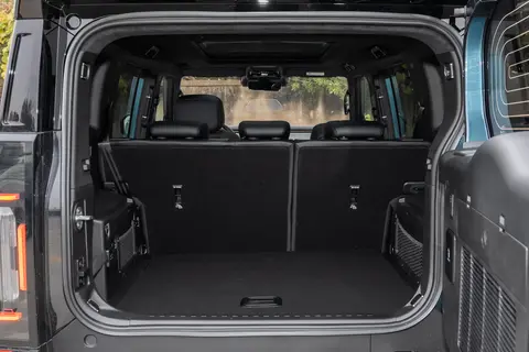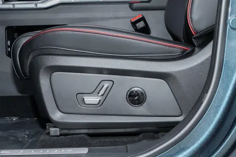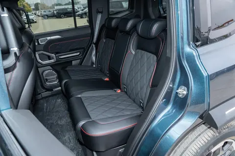 座舱内部也是硬派内饰的设计风格,舒适性和实用性基本符合预期。车内有64英寸的全景大天窗,差不多能覆盖整个车顶,在郊外路段打开天窗后,座舱内光线充足,前后排乘客都能有开阔的视野,通透感还可以。车内的硬派多功能方向盘和钻石纹理实体按键是有特点的配置,实体按键的触感和普通按键不一样,操作反馈很清晰,驾驶员在行驶过程中不用低头,凭着触感就能调节空调、控制音量,能减少驾驶时的分心,保障行车安全。内饰用的是麂皮材质,搭配G318路线饰板氛围灯,能提升触感,也能营造出越野的氛围,改变了硬派SUV内饰粗糙的固有印象。另外,129km发现及以上版本配备的主驾8点立体按摩功能和可一键切换的女王副驾座椅,能适应不同季节和长途驾驶的舒适需求;针对户外可能遇到的颠簸路况,车内还装了9处软包覆拉手,乘客在通过坑洼路段的时候可以抓着拉手稳定身体。