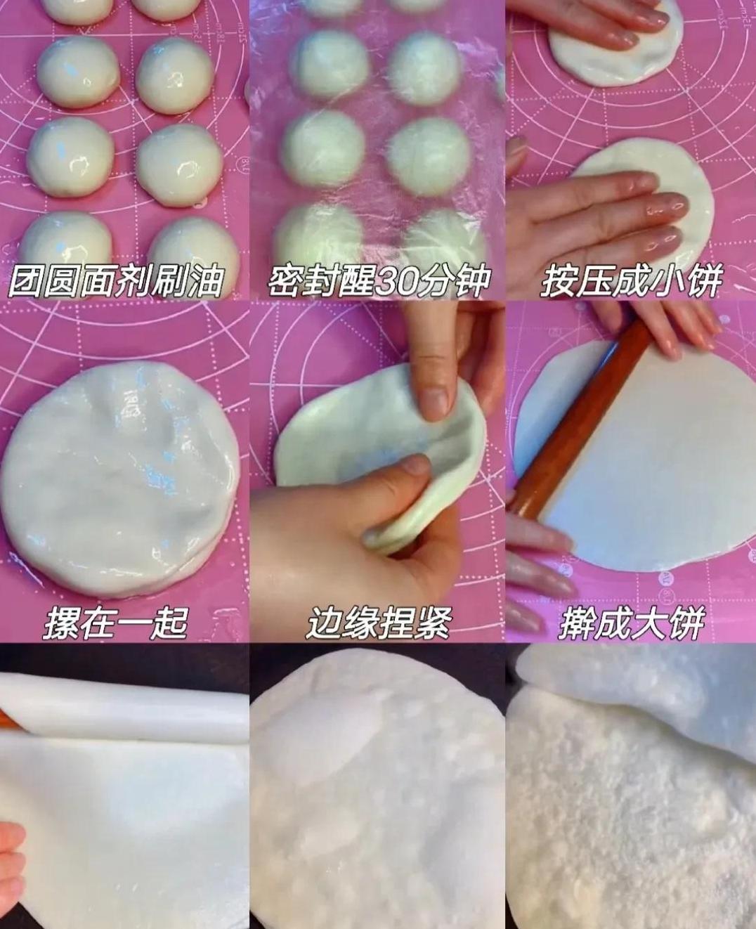 柔和的面团被擀成饼皮,将馅料紧密地包裹其间,再次按平,小火慢煎,不同于快炒的急躁,而是缓慢但稳扎稳打,等待金黄的时刻。