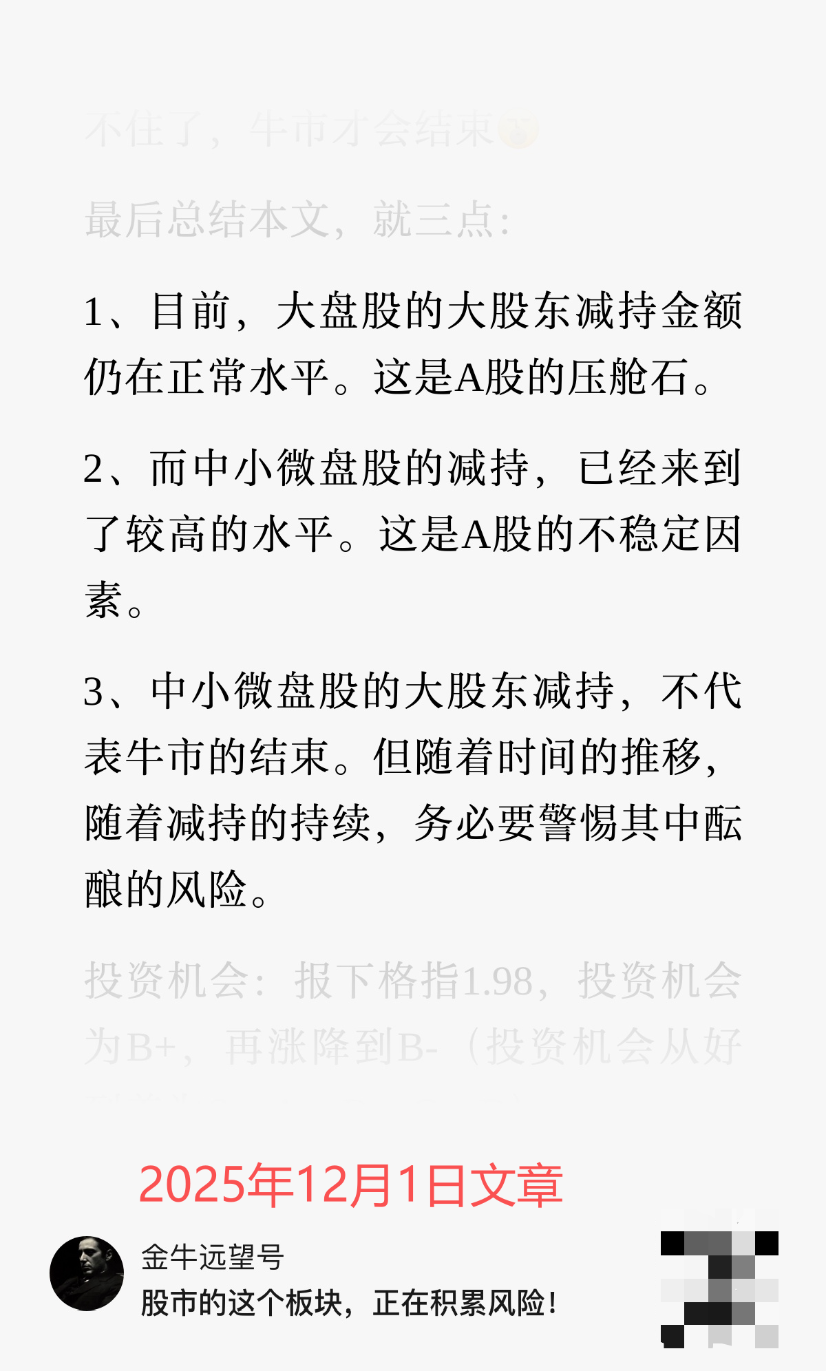 原文:「中小微盘股的减持,已经来到了较高的水平。这是A股的不稳定因素。」