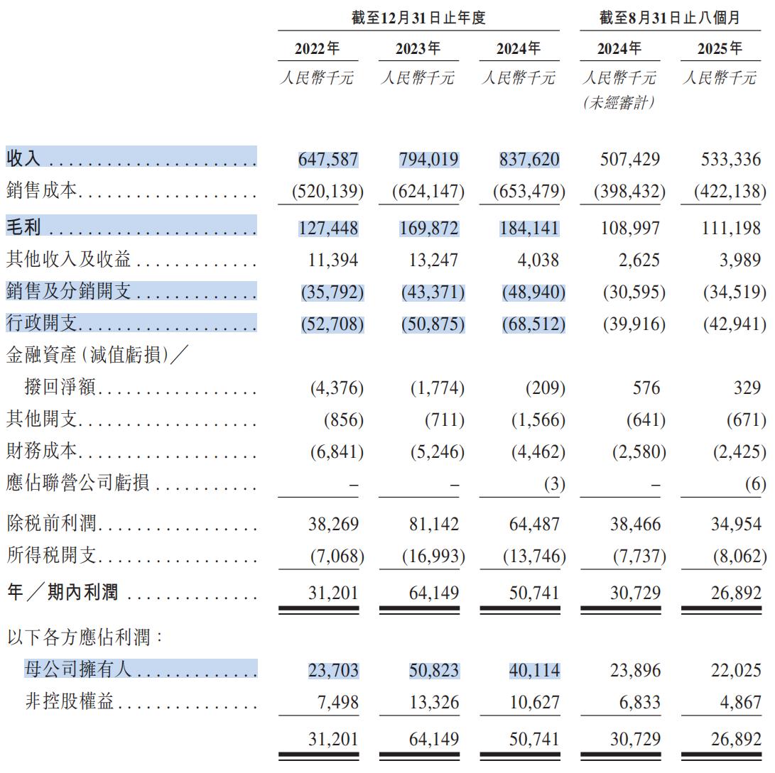 2022年至2024年,公司分别实现营业收入6.48亿、7.94亿和8.38亿,归母净利润0.24亿、0.51亿和0.40亿,毛利率分别为19.7%、21.4%和22.0%。2025年1-8月,公司实现营业收入5.33亿元,归母净利润0.22亿元。