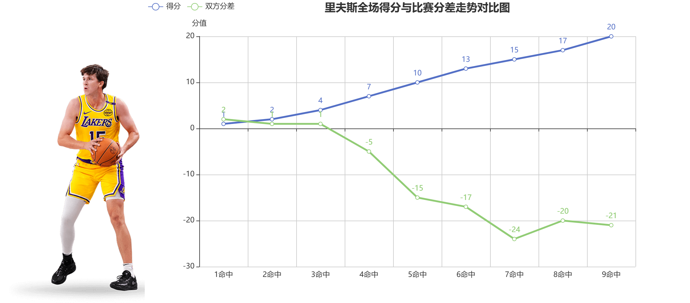 5:第2节打了9分37秒分钟,里夫斯个人第13分,远投三分命中,球飞越防线,得分如愿。湖人分差为-17分。