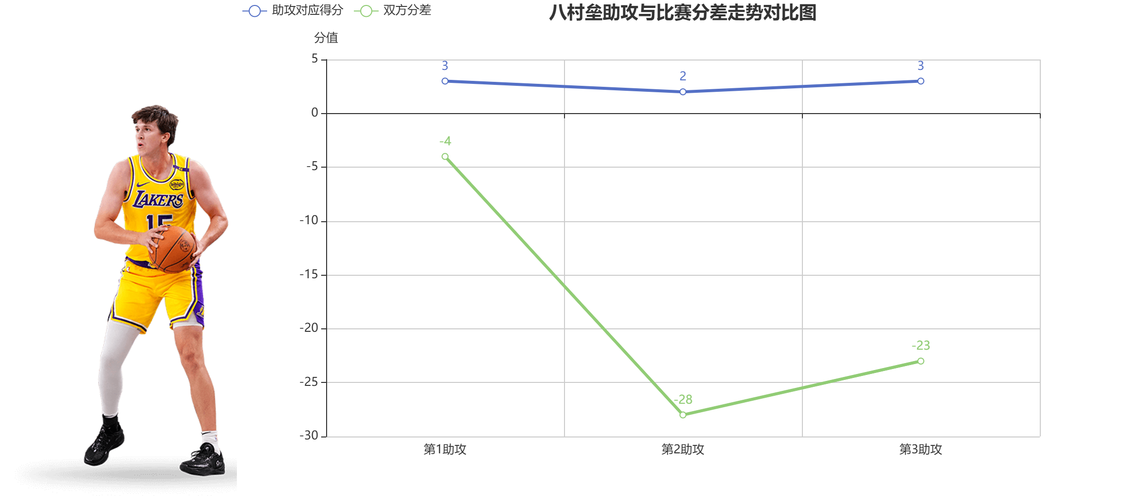 首节还有6分51秒分钟的时候,里夫斯完成个人第1个助攻,助功芬尼-史密斯三分远投精准命中,球飞入篮框,稳稳得分。湖人还落后4分。 末节刚打了11分04秒分钟,里夫斯助詹姆斯命中转身后仰投篮,湖人落后有28分。 最后一节比赛刚打了8分09秒分钟,里夫斯助八村垒雷霆一击,三分尽显霸气。湖人分差为-23分。