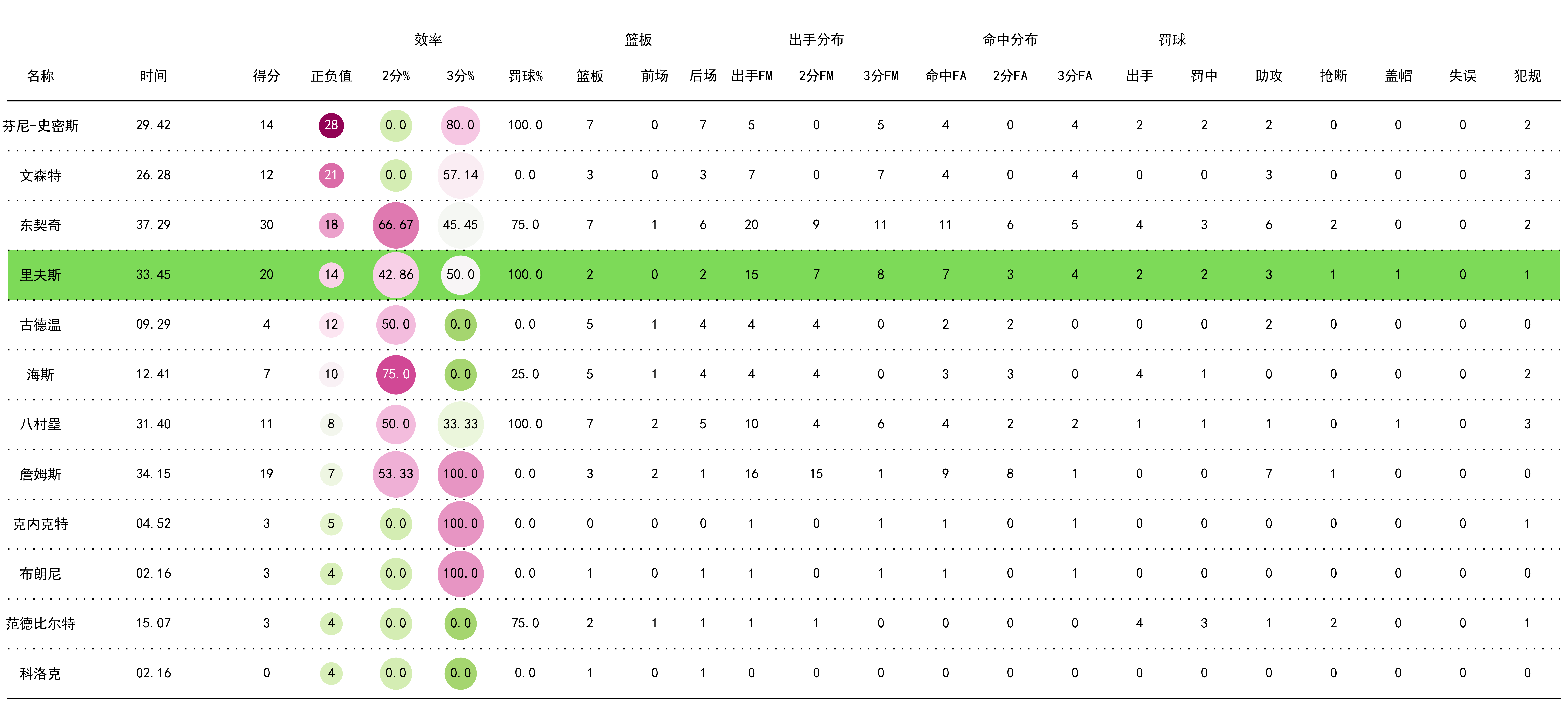 在过去10场比赛,里夫斯场均贡献25.3分,以及3.5个三分,其中在相对比较容易的三个三分投射区域里夫斯分别的投篮命中率为弧顶39.60%,左侧底角33.30%,右侧底角60.00%。也就是说在3分球上本场比赛与过去10场相对比出手占比几乎没有变化,差值为0.76%。