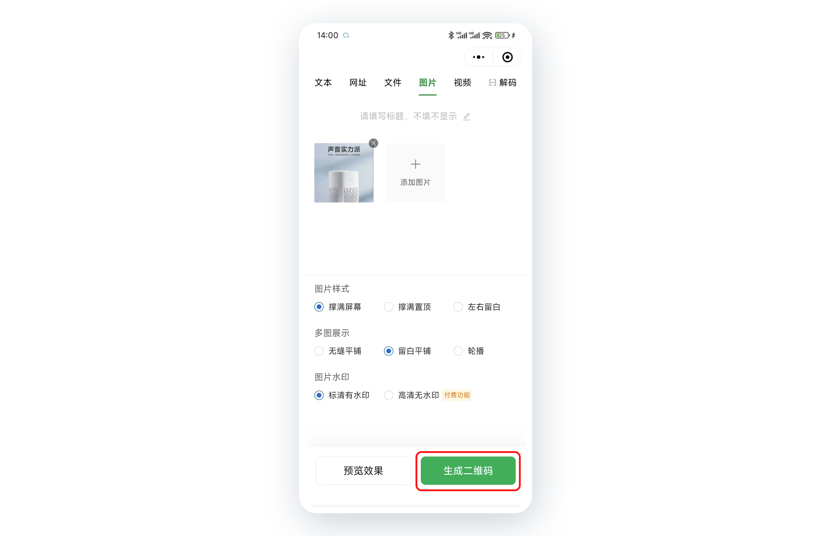 上传图片后,可以对图片展示效果进行设置,比如将图片设置成撑满屏幕,多张图片轮播等。确认后点击【完成编辑】即可生成二维码,支持下载图片和分享使用。