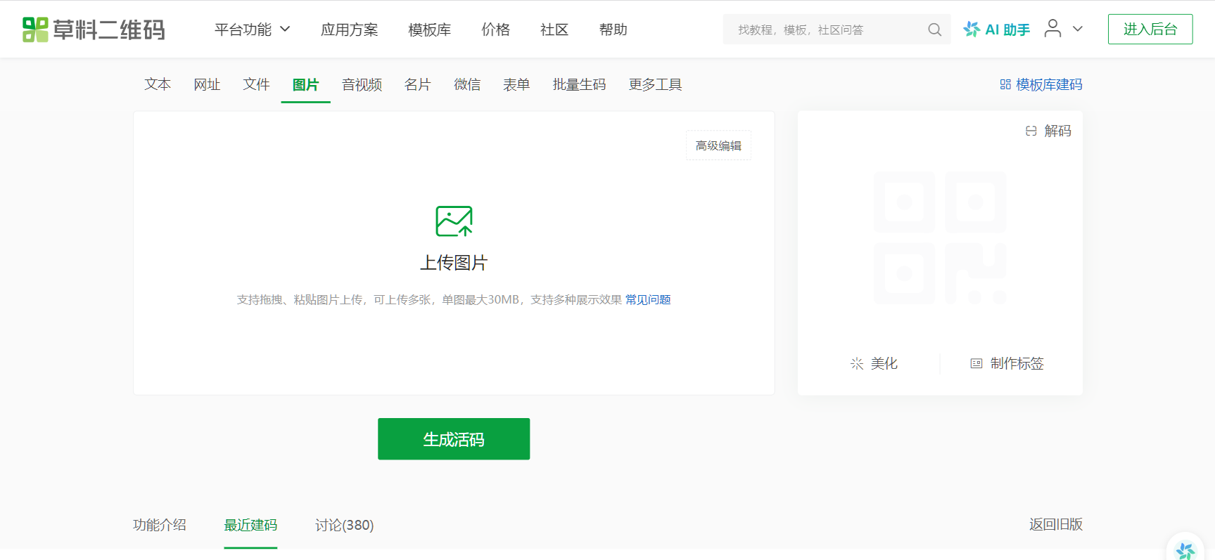 打开微信,搜索并进入“草料二维码”微信小程序,在小程序中点击【生码】,选择头部的【图片】进入图片生码页面。
