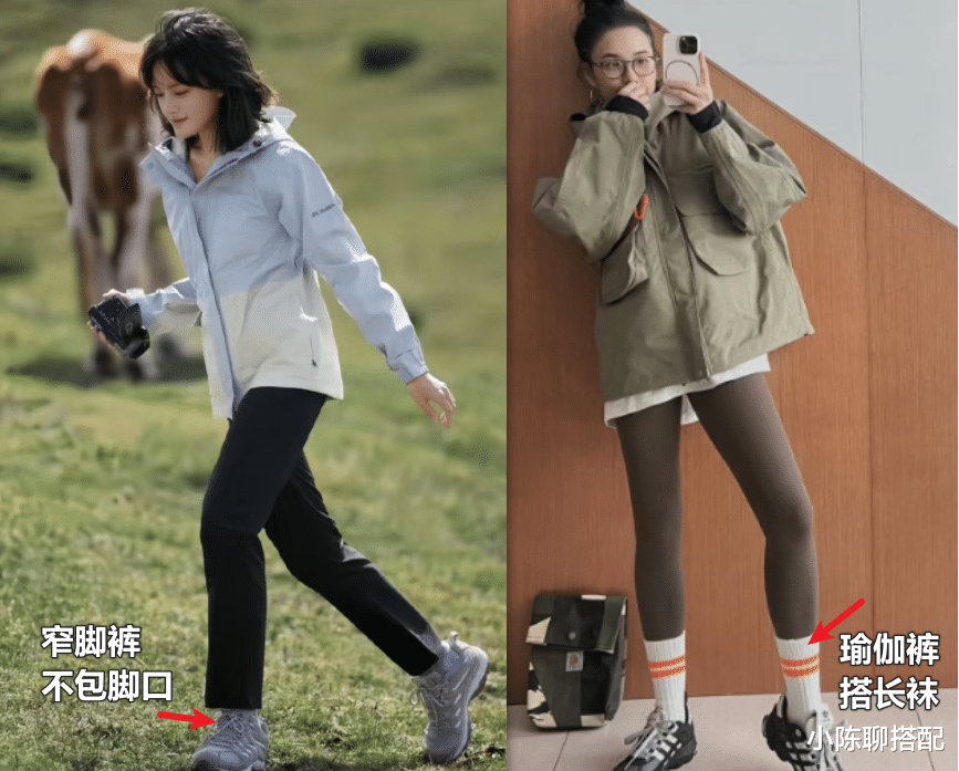 需要注意的是,小脚裤尽量不要包住脚口,避免显得堆积拥挤,瑜伽裤可以在外套一双长袜,看着会更活力充沛。