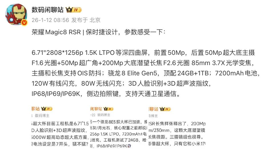 另外,这位博主还曝光了荣耀Magic8 RSR保时捷设计的参数规格信息。