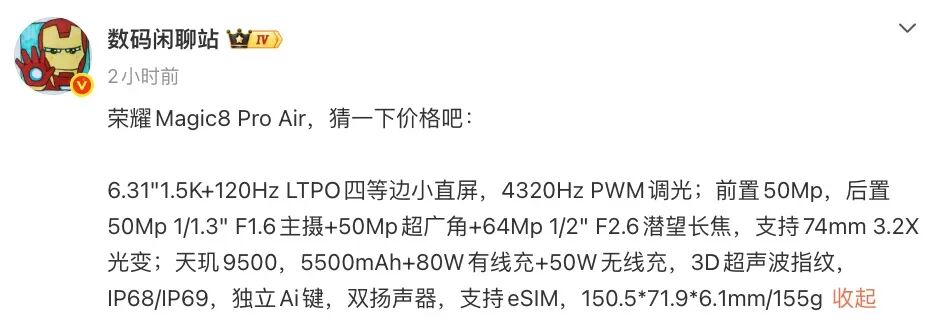 今天,博主@数码闲聊站 曝光了全新荣耀Magic8 Pro Air的详细参数信息。