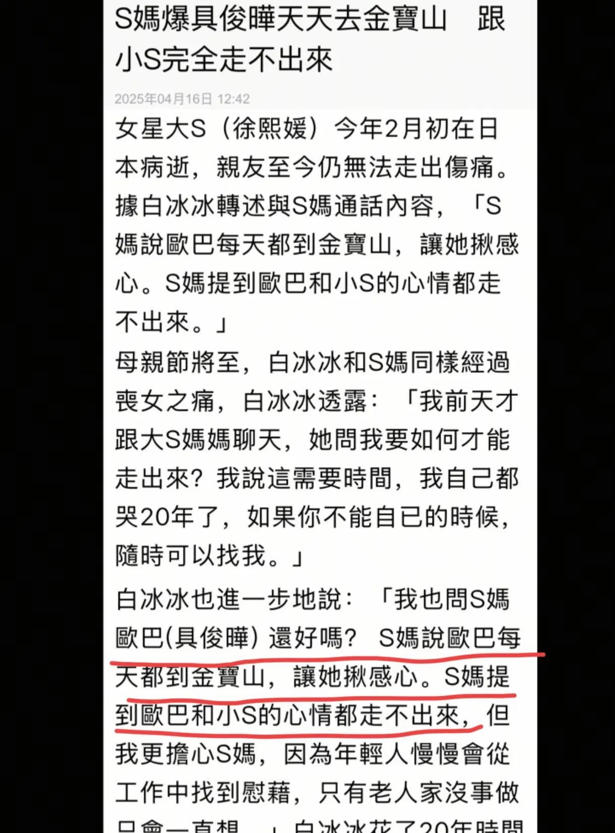 S妈在谈话中透露的细节令人心碎:不仅具俊晔深陷悲痛无法自拔,整个徐家都还在经历着难以愈合的创伤。两个多月过去了,这个曾经风光无限的明星家庭依然被笼罩在失去至亲的阴云中。小S强颜欢笑录制节目的画面、S妈突然落泪的场景、具俊晔日渐消瘦的身影...每一个细节都在诉说着这场突如其来的离别带来的巨大冲击。